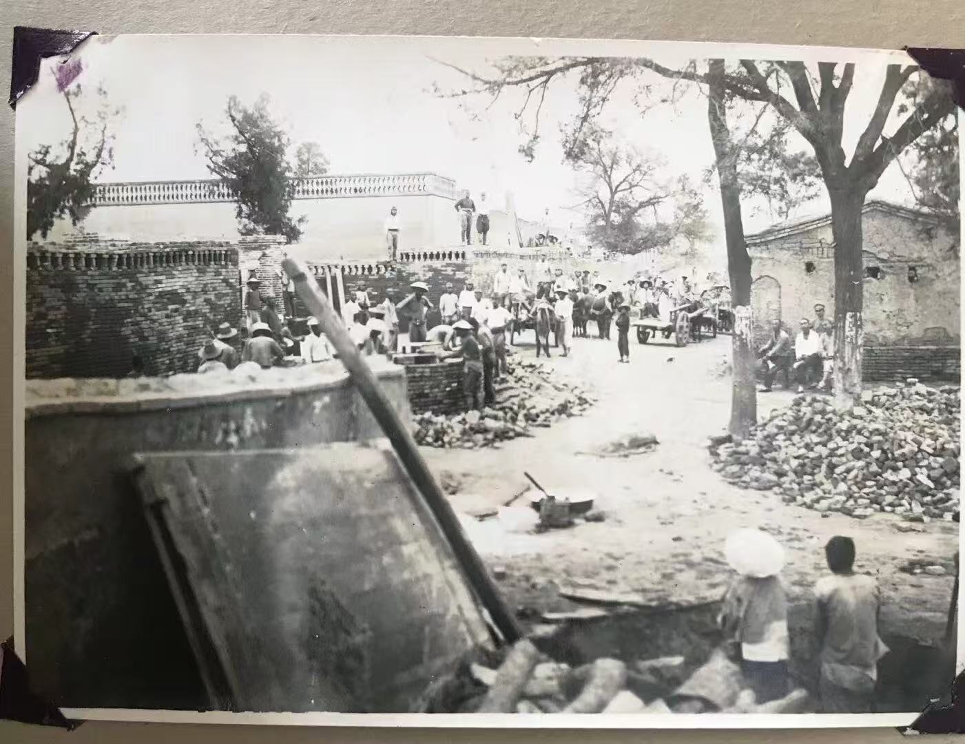 相册里的照片:1939年日军逼迫河北固安群众修筑碉堡。(固安县委办公室供图)